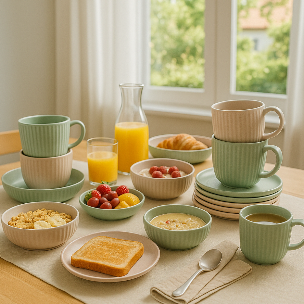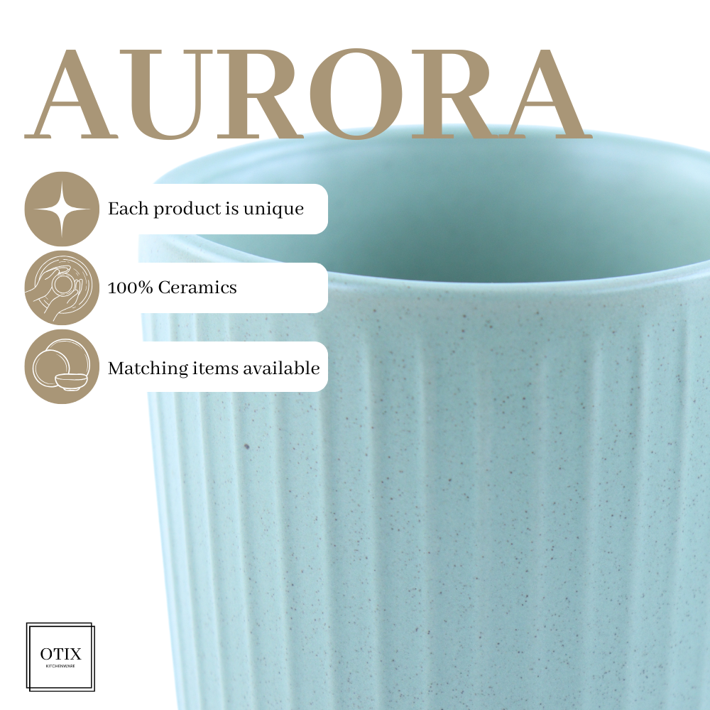 Gemaakt van hoogwaardig aardewerk, stralen de mokken een tijdloze charme uit. De natuurlijke kleuren en het subtiele reactieve glazuur van de AURORA-serie geven elk kopje een uniek karakter. Dankzij de comfortabele oorvorm liggen de mokken prettig in de hand, terwijl het dikke aardewerk de warmte goed vasthoudt.