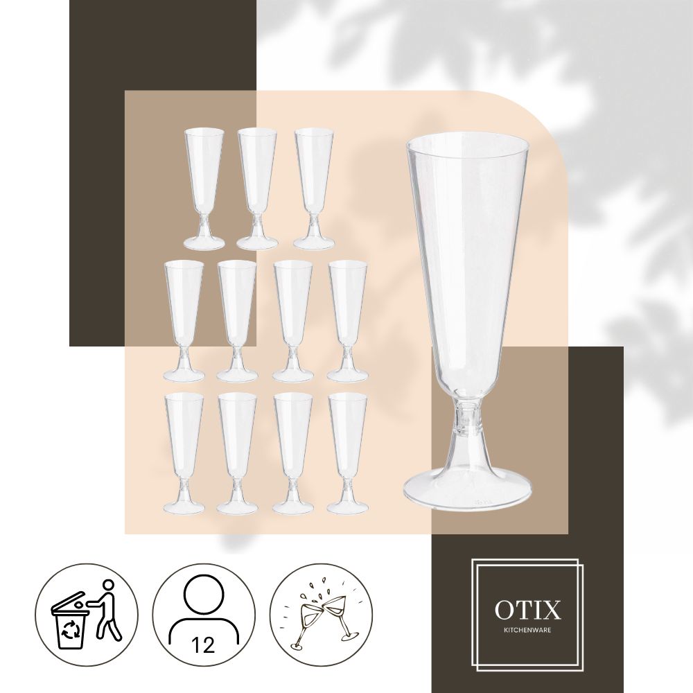 Deze set van 12 champagneglazen van OTIX combineert op perfecte wijze elegantie en gemak voor al je feestelijke aangelegenheden. Vervaardigd uit hoogwaardig plastic, stralen ze dezelfde glans en uitstraling uit als echte glazen, maar zonder het risico van breuk. Bovendien zijn deze glazen herbruikbaar en eenvoudig te reinigen.