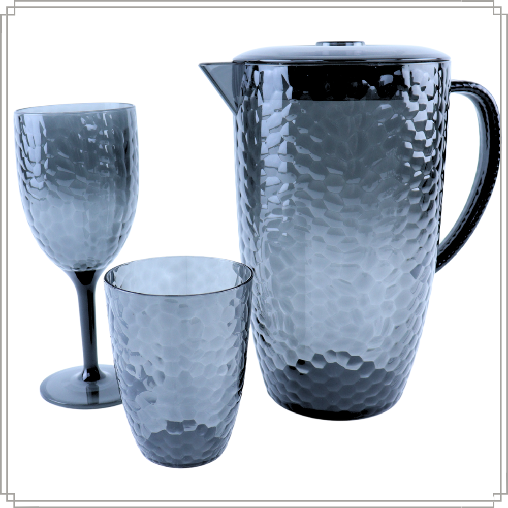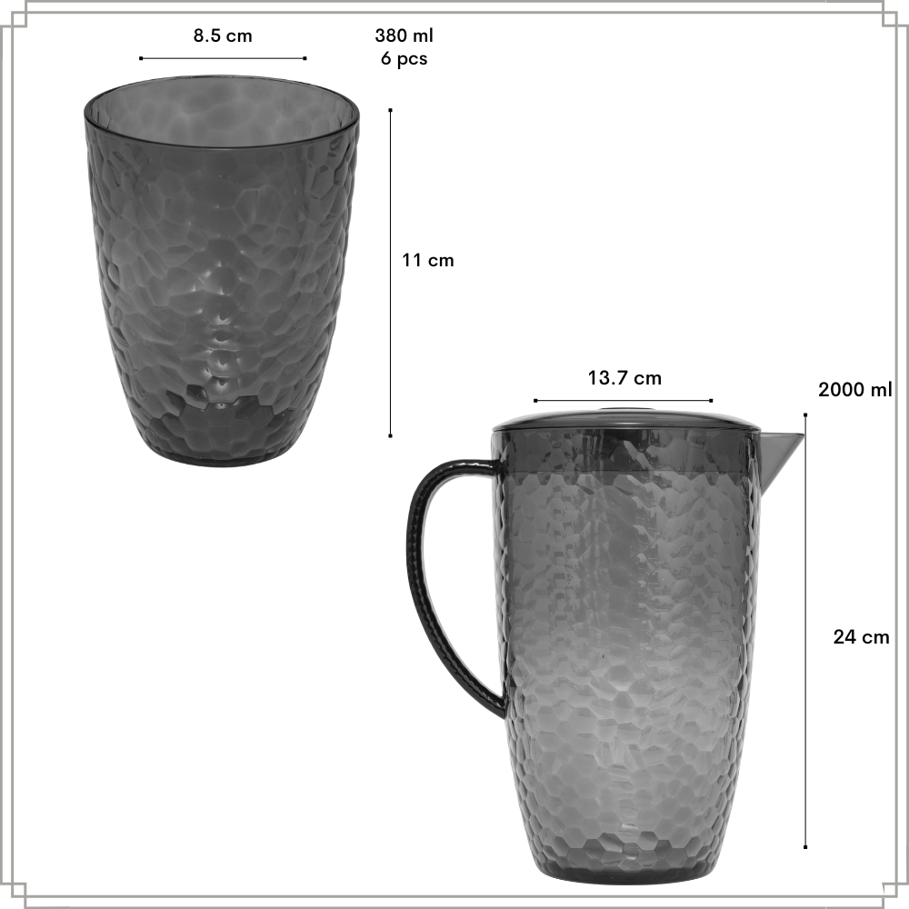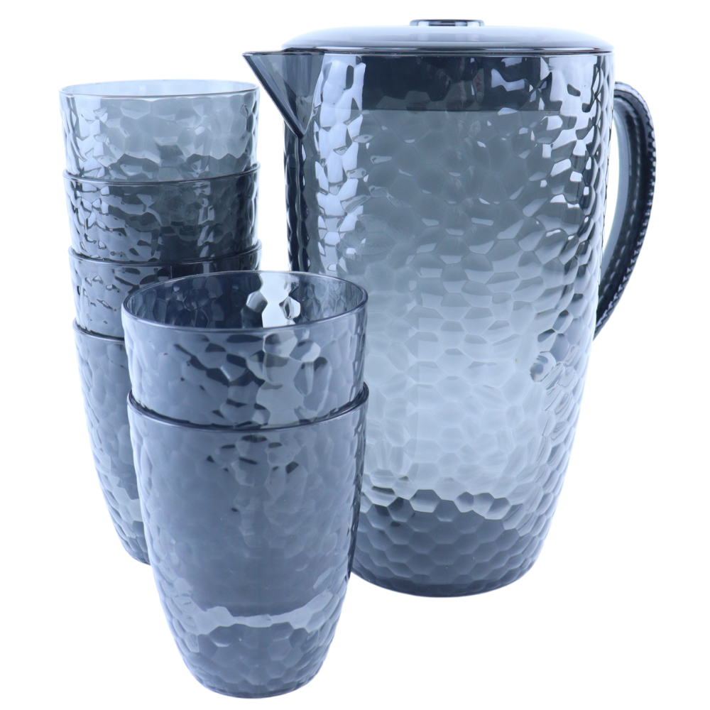 Geniet van je favoriete drankjes met de OTIX 7-delige drinkglazen en limonadekan set. Deze stijlvolle en praktische set bestaat uit 6 herbruikbare waterglazen en 1 ruime schenkkan met deksel, perfect voor water, limonade, frisdrank of cocktails. Het moderne grijze design geeft een elegante uitstraling en past bij elke tafelsetting, zowel binnen als buiten.