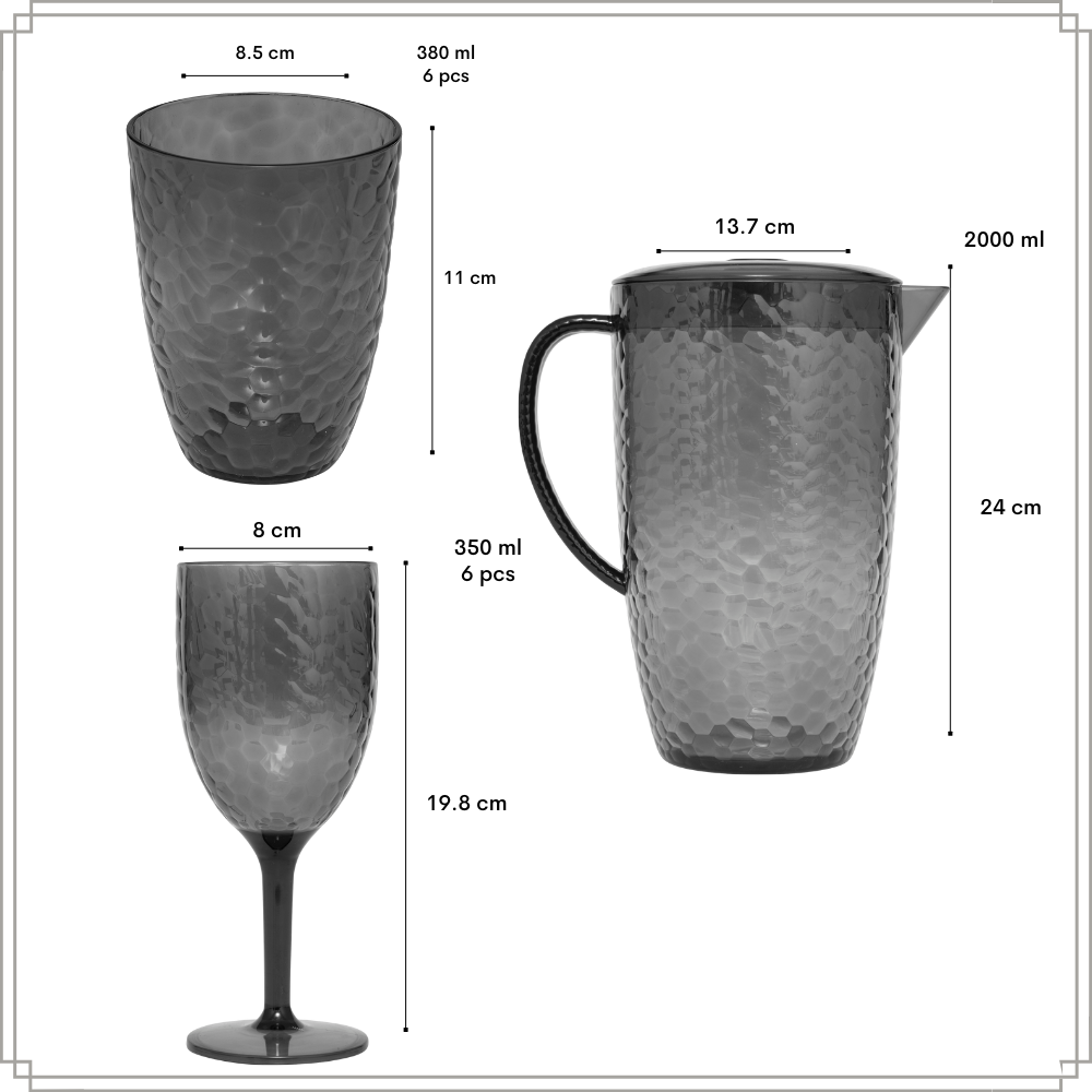 Maak jouw tafelsetting compleet met de OTIX ZEPHYR 13-delige drinkset, bestaande uit 6 waterglazen, 6 wijnglazen en een ruime waterkan met deksel. De moderne grijze tint geeft deze set een stijlvolle en tijdloze uitstraling, perfect voor zowel binnen- als buitengebruik.