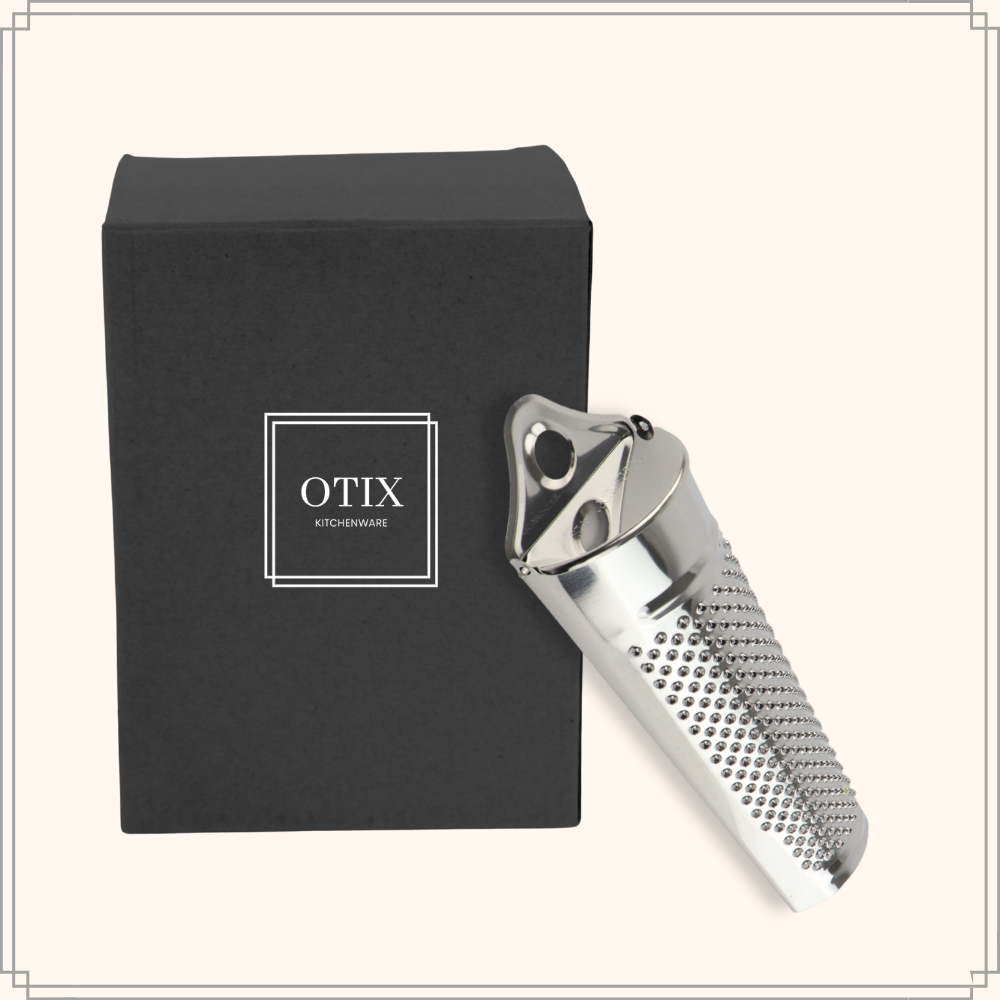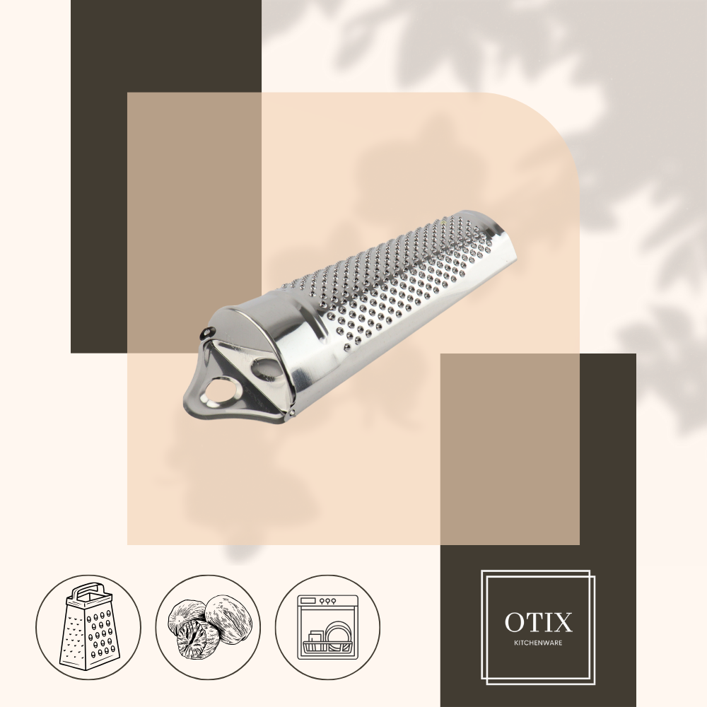 Deze OTIX rasp is geschikt voor het raspen van nootmuskaat. De rasp heeft een uitneembaar zwart bakje, waarin het bolletje nootmuskaat kan worden bewaard. Het materiaal van de rasp is RVS en is daarmee vaatwasser bestendig. Handige rasp voor het fijn raspen van nootmuskaat. Versgeraspte nootmuskaat heeft veel meer smaak en geur dan nootmuskaatpoeder.