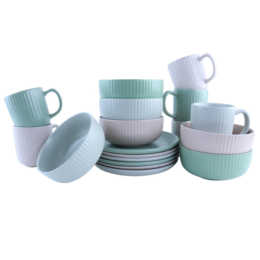 Gemaakt van hoogwaardig aardewerk met een reactief glazuur, is elk stuk in deze set uniek in uitstraling. De warme, natuurlijke tinten en licht rustieke afwerking geven je tafel een eigentijdse en sfeervolle look, perfect voor zowel dagelijks gebruik als speciale gelegenheden.