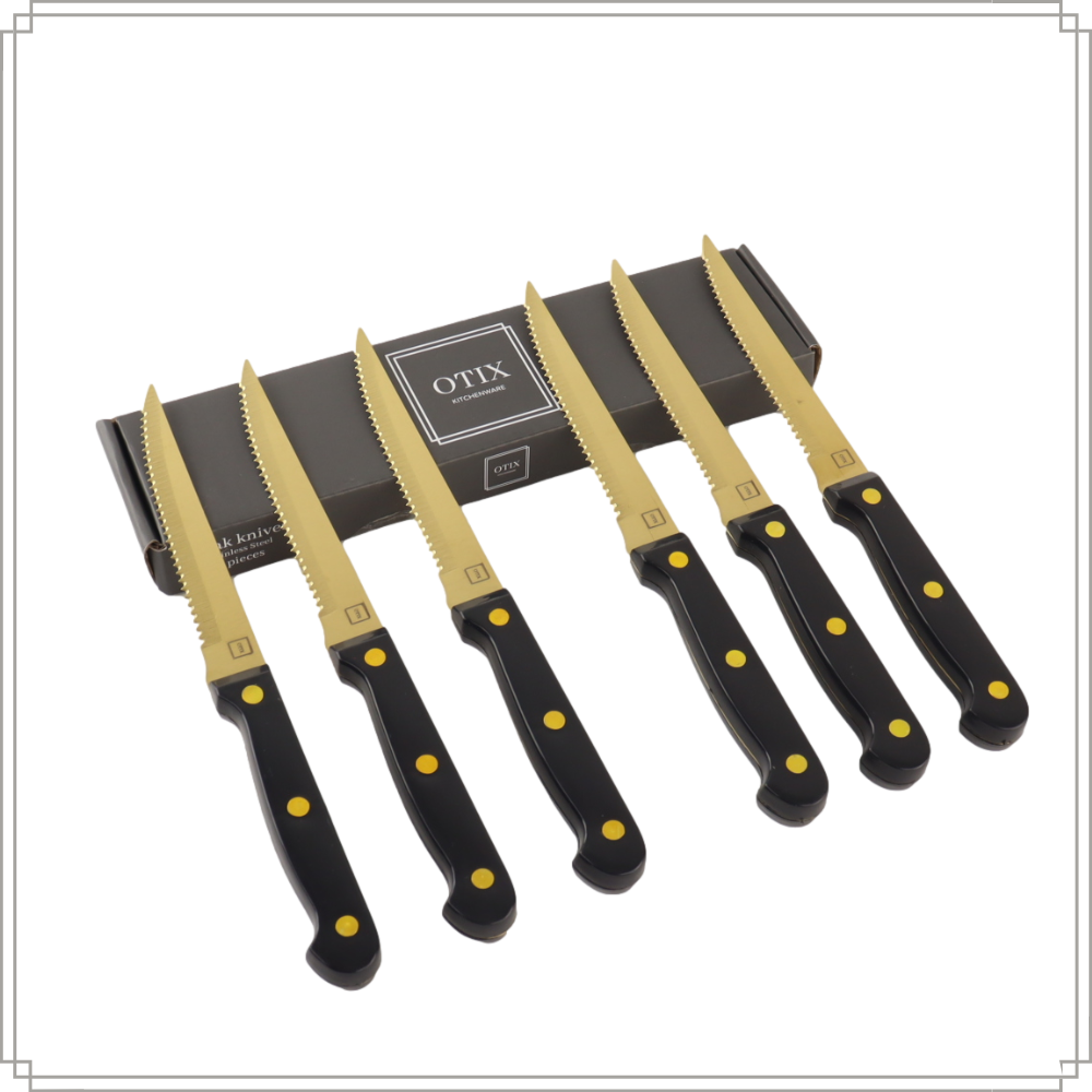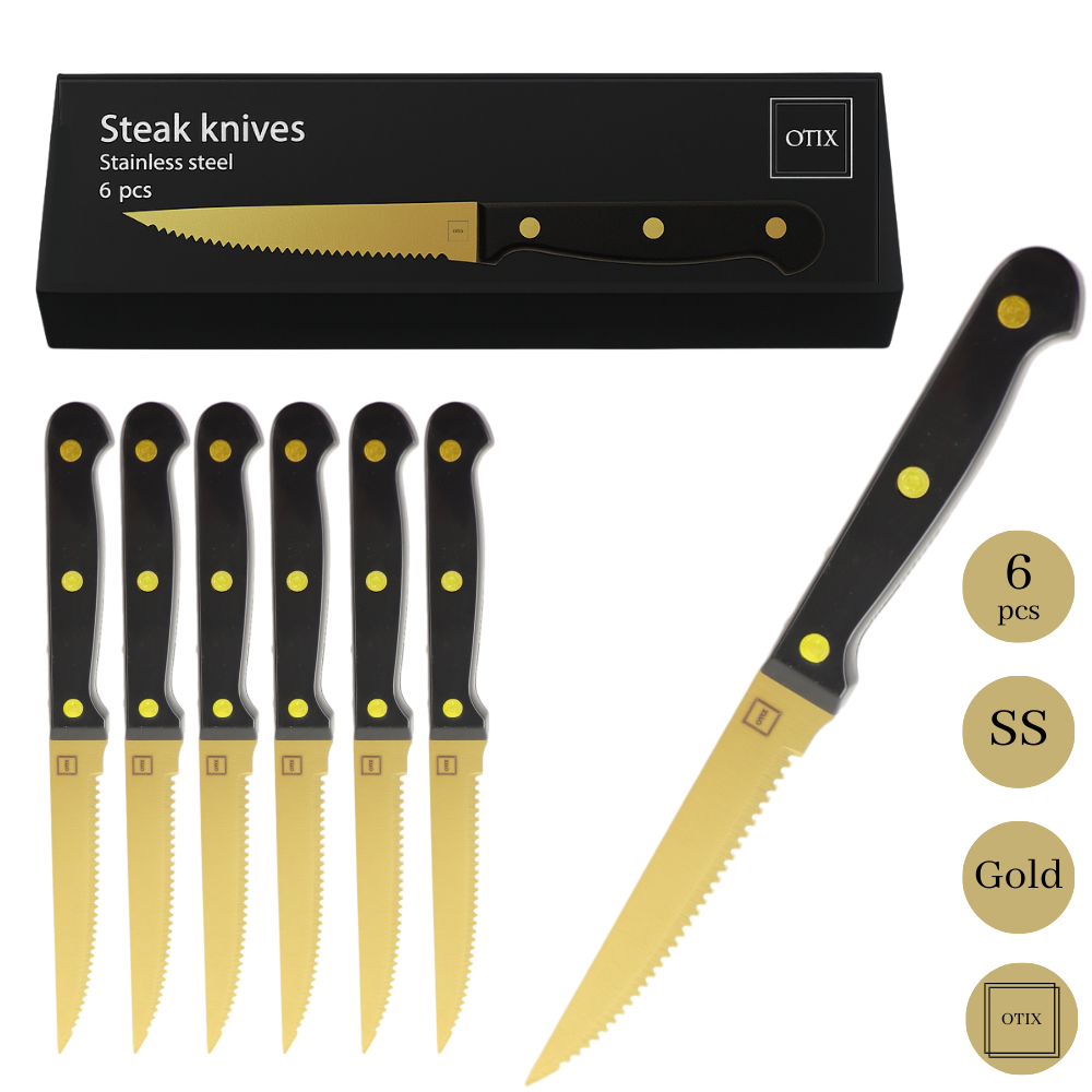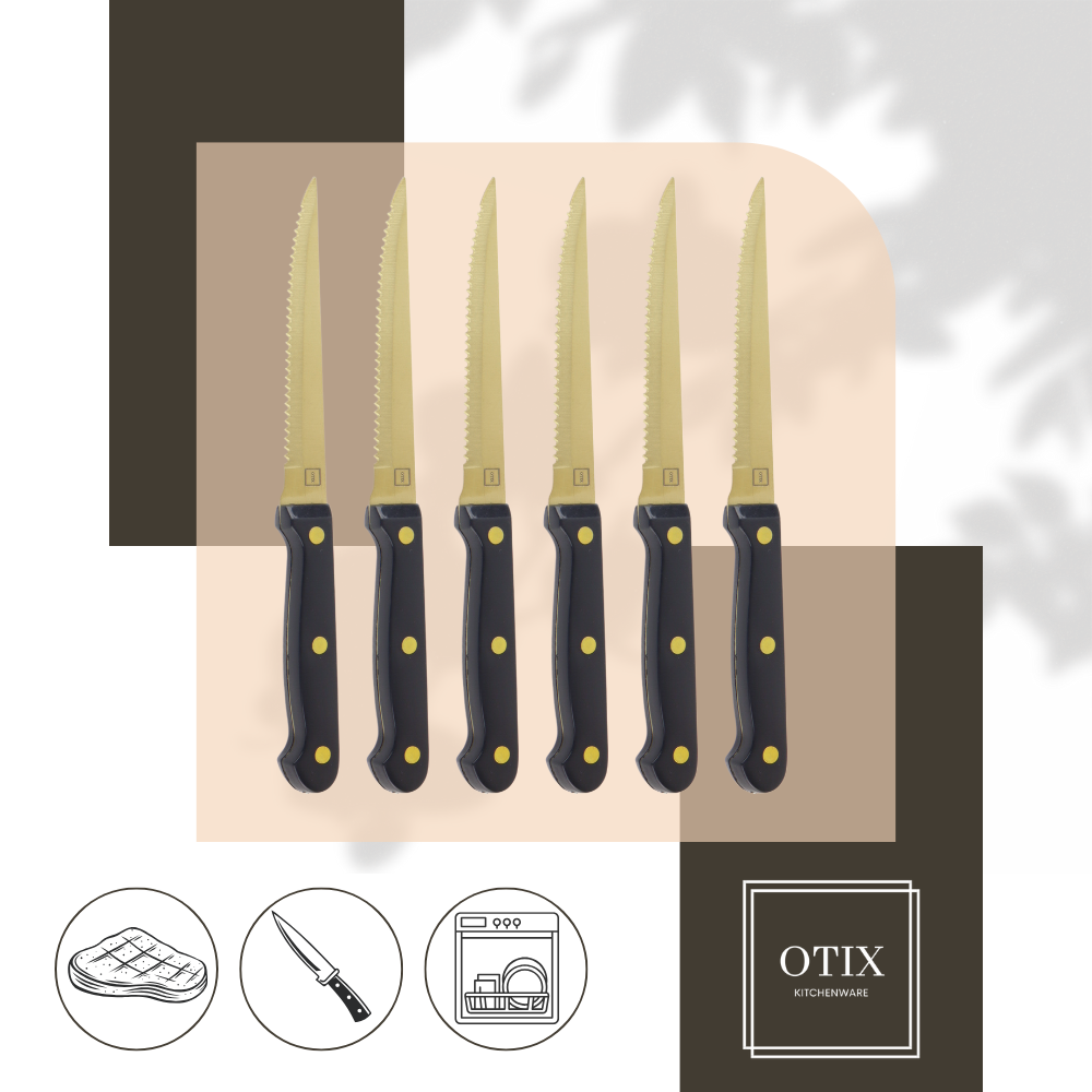 Ontdek de OTIX Steakmessen Set van 6 Stuks in elegante goud-zwarte kleuren. Deze vaatwasserbestendige steakmessenset is gemaakt van roestvrij staal, perfect voor het snijden van steaks met precisie en stijl. Ideaal voor zowel dagelijks gebruik als speciale diners, waar functionaliteit en esthetiek samenkomen. Was de steakmessen altijd zorgvuldig met de hand af. Zo blijft de optimale kleur en glans van het mes behouden en verleng je de levensduur van het product.