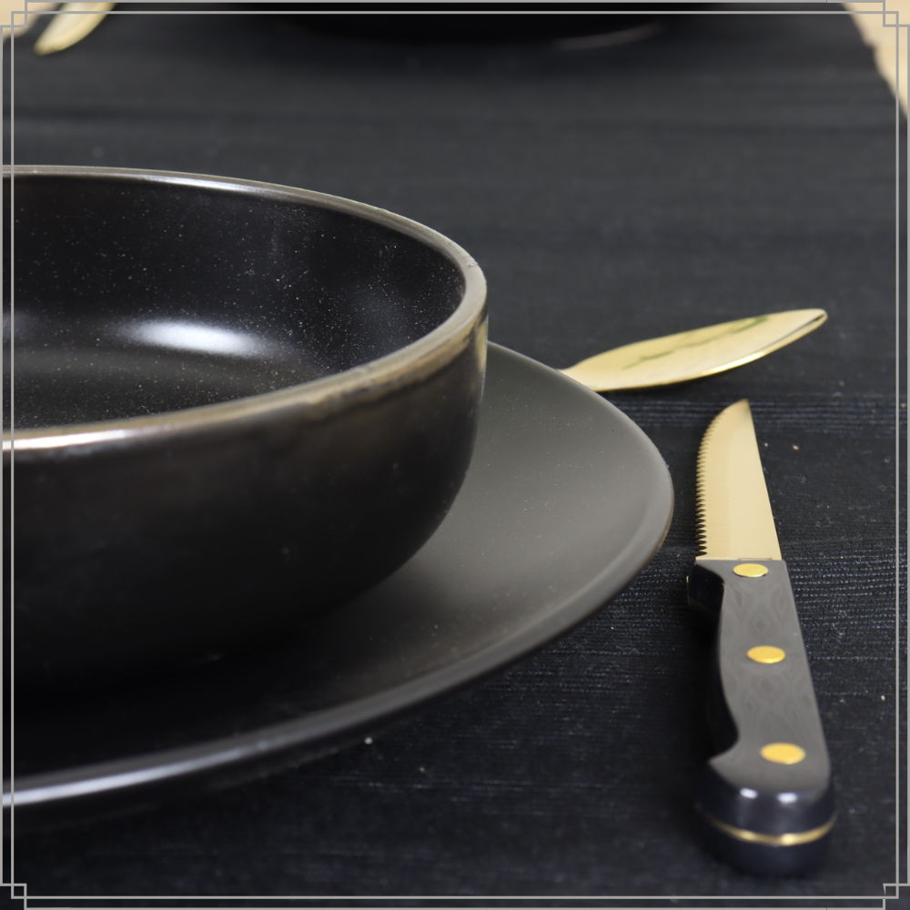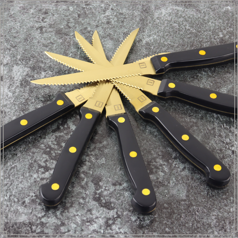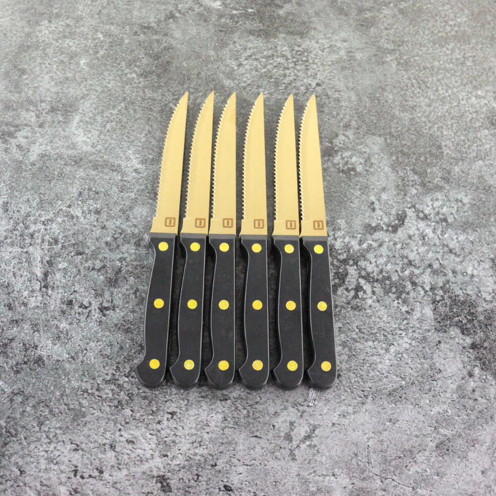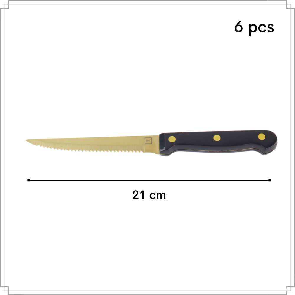 Ontdek de OTIX Steakmessen Set van 6 Stuks in elegante goud-zwarte kleuren. Deze vaatwasserbestendige steakmessenset is gemaakt van roestvrij staal, perfect voor het snijden van steaks met precisie en stijl. Ideaal voor zowel dagelijks gebruik als speciale diners, waar functionaliteit en esthetiek samenkomen. Was de steakmessen altijd zorgvuldig met de hand af. Zo blijft de optimale kleur en glans van het mes behouden en verleng je de levensduur van het product.