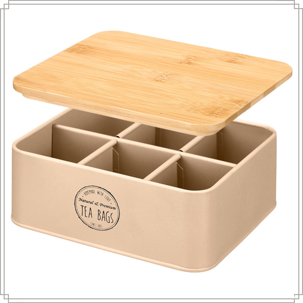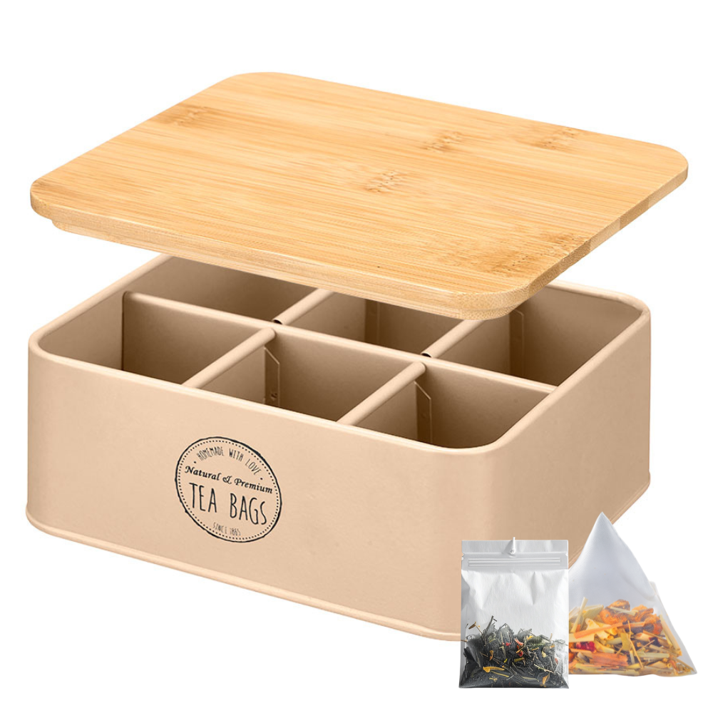 De theedoos beschikt over 6 handige vakken, perfect voor het overzichtelijk bewaren van verschillende soorten theezakjes. Dankzij het stevige metalen ontwerp blijft de inhoud goed beschermd, terwijl het bamboe deksel een warme, natuurlijke uitstraling toevoegt.