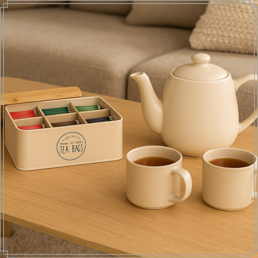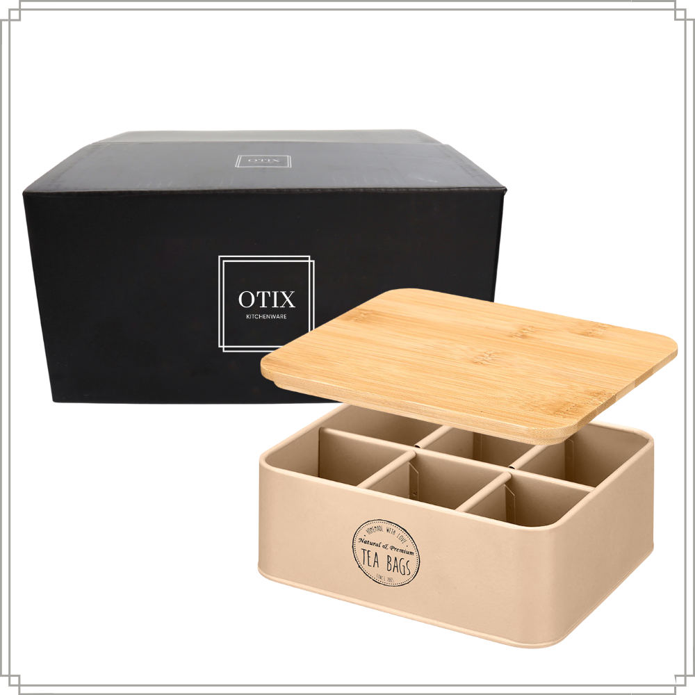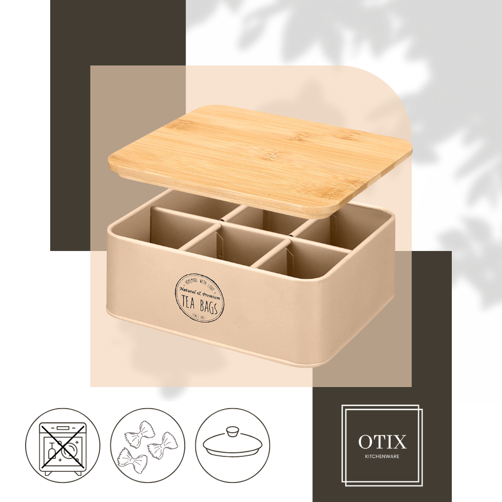 Bewaar jouw favoriete theesmaken stijlvol met de OTIX Theedoos VIRGO. Deze elegante theekist combineert een moderne beige metalen behuizing met een deksel van natuurlijk bamboehout – een echte blikvanger in elke keuken of op de ontbijttafel.