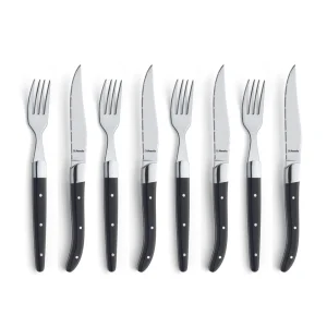 - Stoer en elegant: De stoere zwarte kleur van de handvatten voegt een vleugje luxe toe aan je tafelsetting. De elegante details en bruine details in het handvat maken deze steakmessen echt uniek. Deze steakmessen zijn niet alleen functioneel, maar ook een visueel genot.