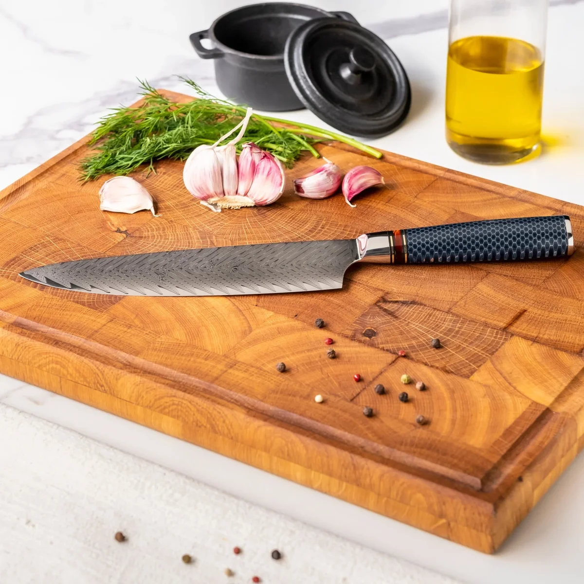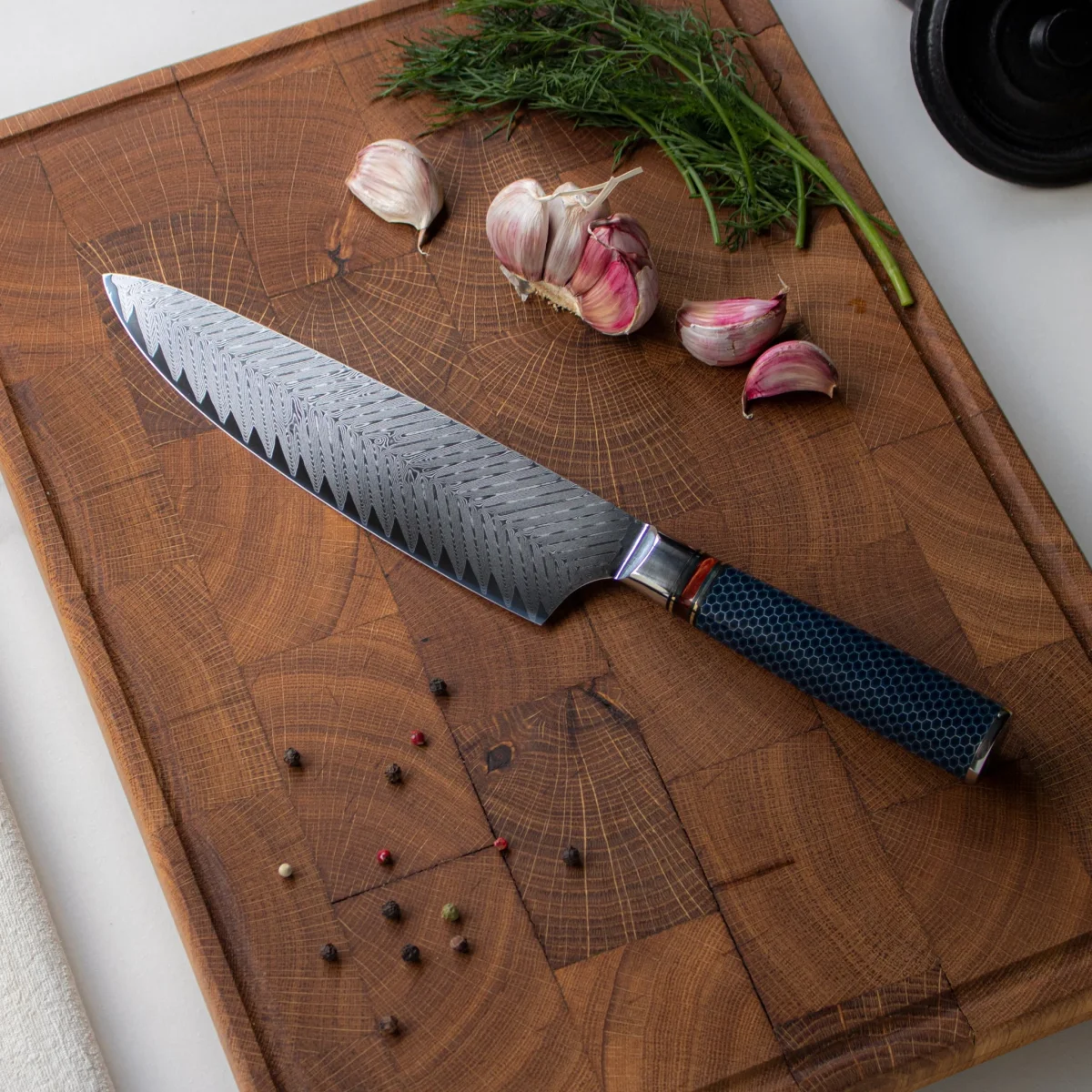 - 67-laags damaststaal met VG10-kern: Het lemmet bestaat uit 67 lagen staal met een kern van hoogwaardig VG10-staal. Deze opbouw zorgt voor langdurige scherpte en uitstekende prestaties.