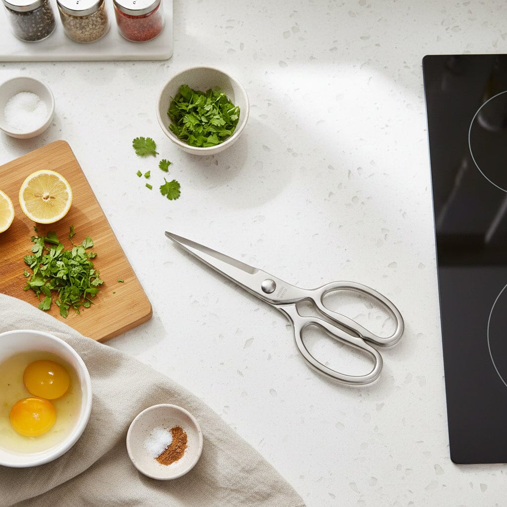 Gemaakt van premium RVS, is deze keukenschaar bestand tegen roest en aanslag. Hierdoor blijft de schaar langer scherp, mooi en hygiënisch. Het ergonomische handvat ligt comfortabel in de hand en is geschikt voor zowel links- als rechtshandige gebruikers. Dankzij de verwijderbare schroef kan de schaar eenvoudig volledig worden gedemonteerd voor grondige reiniging.