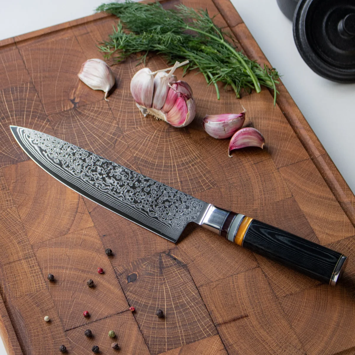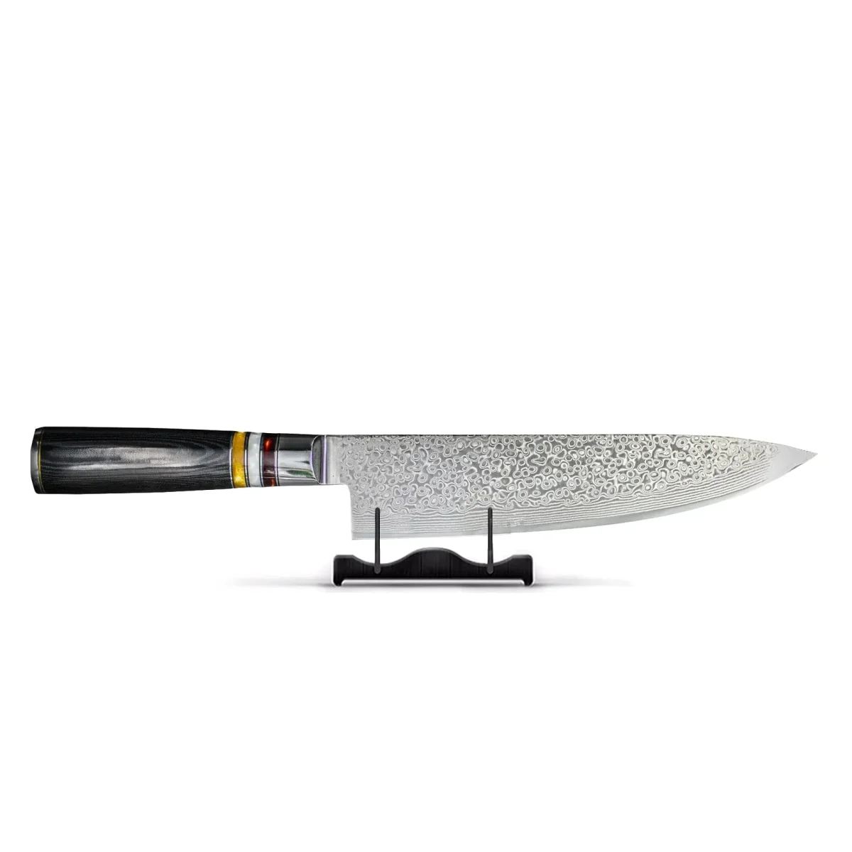 - 67-laags damaststaal met VG10-kern: Het lemmet is opgebouwd uit 67 lagen staal met een kern van VG10-staal. Deze combinatie zorgt voor optimale hardheid en langdurige scherpte.