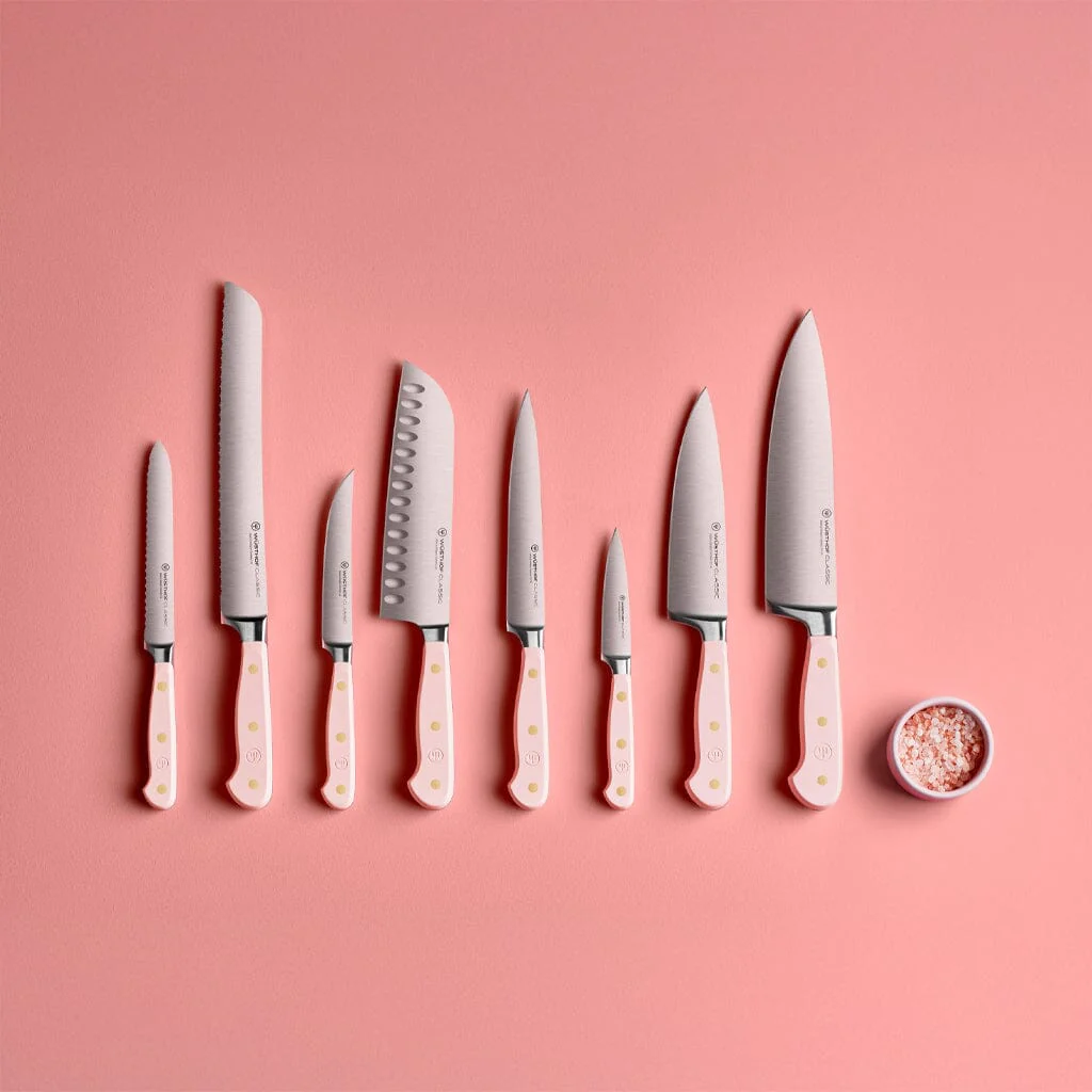 Het Wüsthof Classic Colour Koksmes Pink Himalayan Salt 20 cm is een onmisbare allrounder voor elke thuischef. Het hakt moeiteloos een kool in stukken of snijdt in een handomdraai flinterdunne plakjes van een tomaat. Dankzij het brede lemmet is het ook perfect geschikt om ingrediënten op te scheppen en naar de pan te verplaatsen. Het fijne snijvlak is vlijmscherp, maar we raden af het te gebruiken voor het snijden van botten of zeer harde vruchten zoals kokosnoten. Voor die taken is een Europees hakmes of slagersmes meer geschikt.
